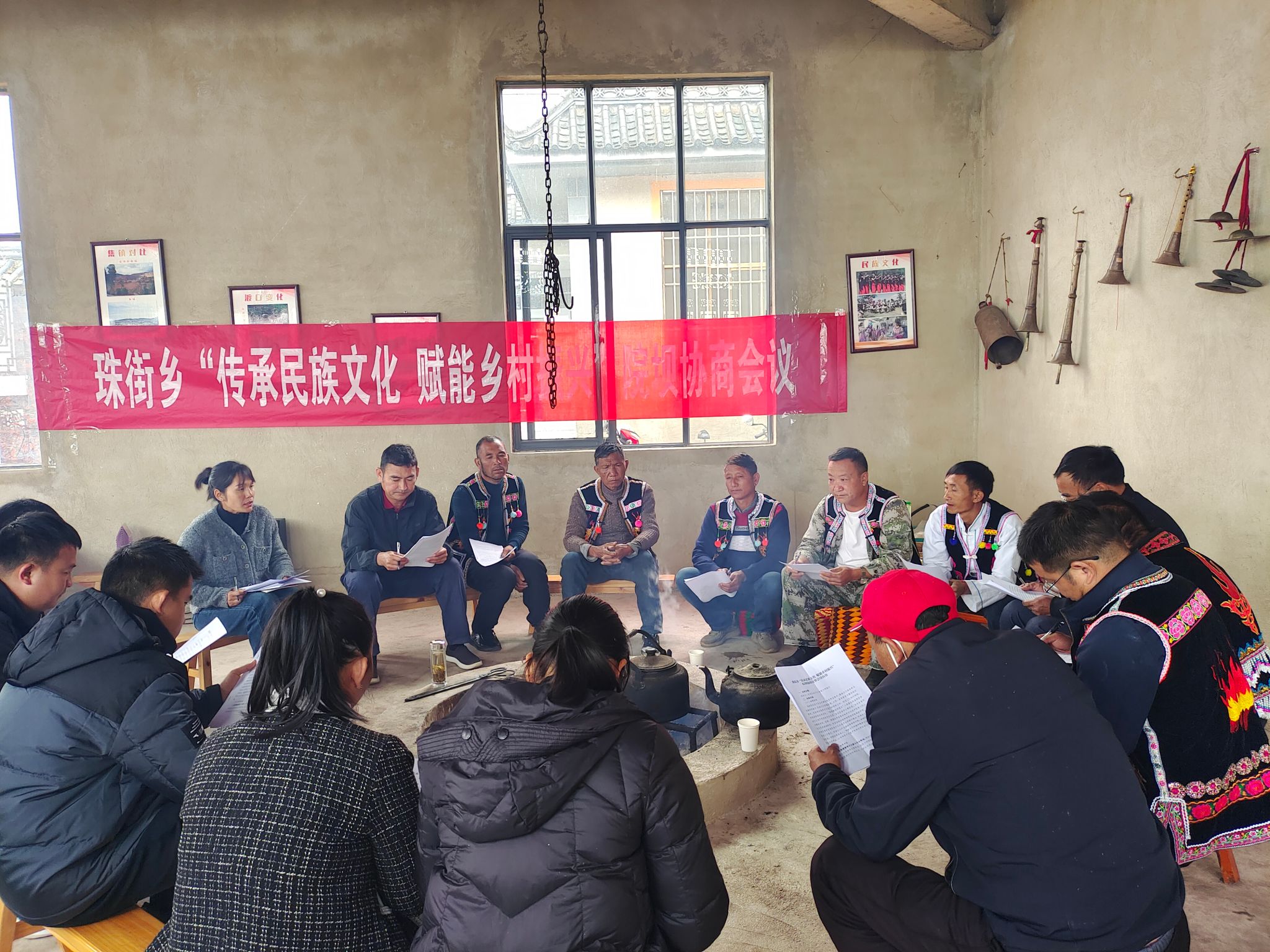近日,珠街乡召开以“传承民族文化 赋能乡村振兴”为主题的“院坝协商”议事会议,珠街乡“院坝协商”议事会成员、文化传承人代表、群众代表等围坐在乡愁火塘旁共商民族文化传承发展,助推乡村振兴。