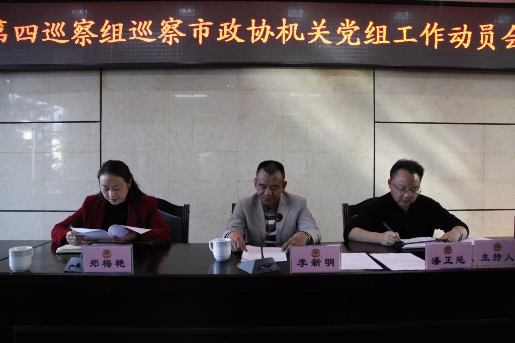 李新明指出,要充分认识政治巡察的重要意义,增强管党治党的政治责任,准确把握巡察工作的主要任务和工作方式,深刻领会习近平总书记巡视工作思想,聚焦坚持党的领导、加强党的建设、全面从严治党,提高政治站位,坚持以下看上,突出“关键少数”,着力查找党的领导弱化、党的建设缺失、全面从严治党不力,党的观念淡漠、组织涣散、纪律松弛,管党治党宽松软等问题,推动市政协机关党组和党员领导干部增强“四个意识”;做好巡察工作是市委第四巡察组和市政协机关党组共同的政治责任,必须紧密协作,确保巡察工作有序开展。市委第四巡察组依靠市政协机关党组开展工作,不干预市政协机关的正常工作,不履行执纪审查的职责。巡察组在巡察期间将认真贯彻中央八项规定精神和省委、市委实施办法,严格遵守政治纪律、保密纪律和廉洁自律的各项规定,自觉约束和规范自己的行为,树立巡察干部的良好形象。
