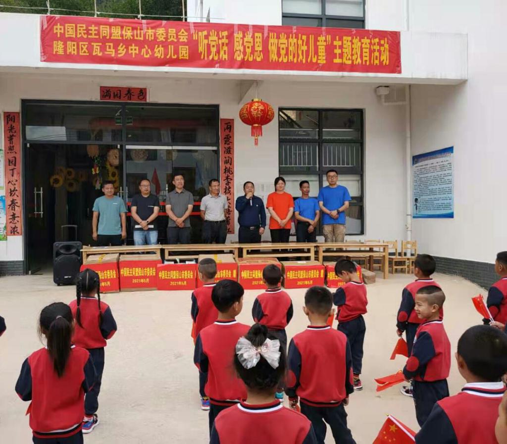 5月31日,民盟保山市委会组织到隆阳区瓦马彝族白族乡中心幼儿园协助开展“听党话 感党恩 做党的好儿童”主题教育暨社会服务活动,让孩子们感知中国共产党的伟大,把“听党话 感党恩”的爱党爱国情怀厚植于孩子们内心深处。