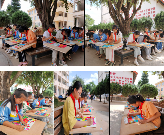 六月的阳光,炽热而明亮。小画家们坐在浓浓的树荫下,将画板置于双腿上,手握着画笔,全神贯注地绘制着自己的作品,童心童趣、快乐无限。他们有的动笔勾线、有的认真思考、有的仔细涂色……都争相在画纸上一展自己的风采,努力绘出主题突出、构图饱满、配色丰富的图画,每一笔都饱含着激情,每一笔都蕴含着希望。一幅幅精美的图画在小画家们灵动的笔下跃然纸上,每一幅都精准的体现主题思想,个性鲜明,将深深的爱党爱国情融入在笔墨之中。