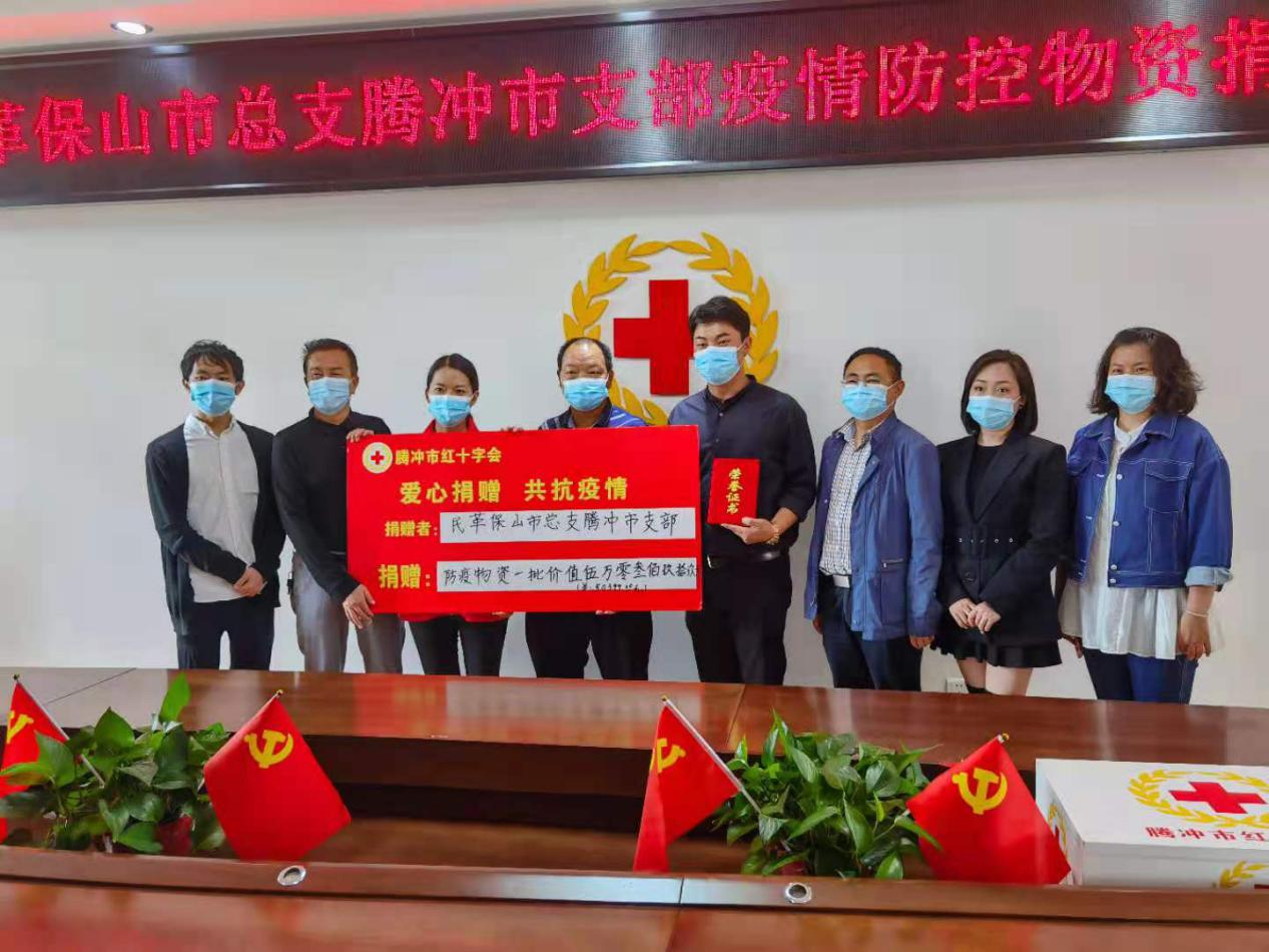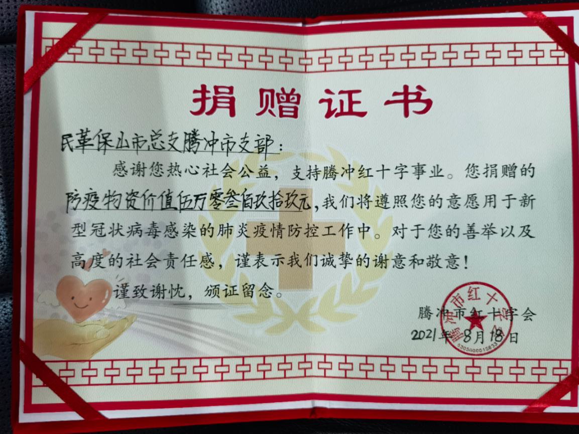 8月18日,民革保山市总支腾冲市支部向腾冲市红十字会捐赠了一批防疫物资。中共腾冲市委统战部相关领导、民革保山市总支腾冲市支部主委徐伟智及部分党员参加捐赠活动。捐赠仪式上,腾冲市红十字会向民革保山市总支腾冲市支部颁发了捐赠证书,感谢民革腾冲市支部对腾冲疫情防控工作的支持。