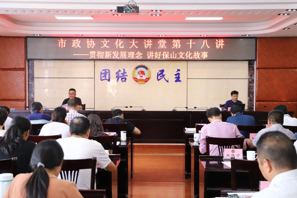 为推进市政协机关党史学习教育活动走深走实,学习传承好保山优秀历史文化,9月15日,市政协举办文化大讲堂第十八讲,邀请保山学院、保山文化研究院副研究馆员段龙山以《贯彻新发展理念 讲好保山文化故事》为专题进行学习辅导。市政协机关干部职工、市级各民主党派和市工商联等50余人聆听了讲座。