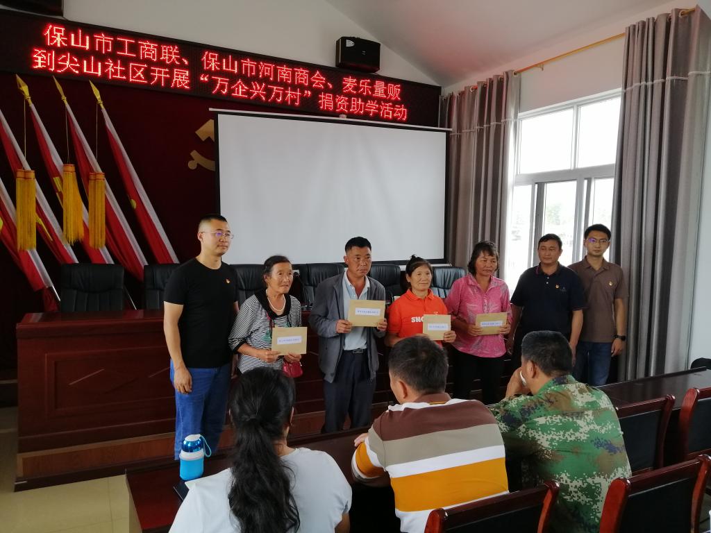 捐资仪式上,保山市工商联党支部书记强调,百年大计、教育为本。近年来,尖山社区高度重视教育,关怀学子,成效显著,每年都有一定数量的学生考上大学。作为此次受奖励的学生家长要引导孩子心怀感恩,感恩党和政府的关怀,感恩保山市河南商会和麦乐量贩对大家的帮助;同时要教育孩子在大学期间不能虚度光阴,努力学习理论知识,规划好未来,争取大学毕业后成为对国家、对社会、对家庭有用的人。保山市河南商会和麦乐量贩向考取云南民族大学和玉溪师范学院的两名一本院校的学生分别捐资3000元,向考取玉溪师范学院和湖北第二师范学院的两名二本院校的学生分别捐资2000元。近年来,保山市河南商会和麦乐量贩积极响应工商联的号召,投身“万企帮万村”精准扶贫行动,致力于公益事业,并表示今后也将继续弘扬企业家精神,投身“万企兴万村”行动,充分展现当代民营企业家风采。