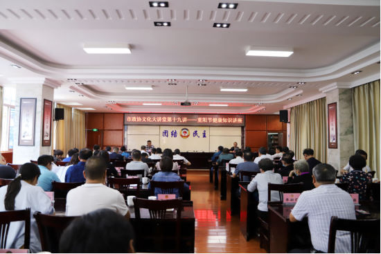 10月12日,市政协举办文化大讲堂第十九讲——重阳节健康知识专题讲座活动,市政协机关干部职工、退休干部职工、市级各民主党派、市工商联和市纪委市监委驻市政协纪检监察组等70余人聆听了讲座。