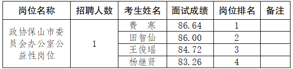 根据《政协保山市委员会办公室关于公开招聘公益性岗位人员的公告》等规定,现将政协保山市委员会办公室关于公开招聘公益性岗位人员面试成绩及岗位排名情况予以公示,如有异议,请及时向政协保山市委员会办公室反映。同时,根据面试成绩由高到低按招聘人数与体检人数1:1的比例确定体检对象。若出现所确定体检对象放弃体检的,按规定进行递补。