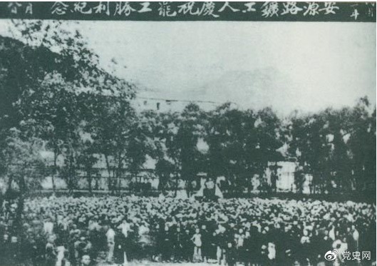 1922年9月14日-18日 安源路矿工人在毛泽东、李立三、刘少奇等组织领导下,举行罢工斗争,取得胜利。图为安源路矿工人庆祝罢工胜利。
