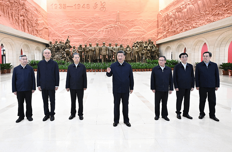 党的二十大闭幕不到一周,中共中央总书记、国家主席、中央军委主席习近平带领中共中央政治局常委李强、赵乐际、王沪宁、蔡奇、丁薛祥、李希,专程从北京前往陕西延安,瞻仰延安革命纪念地,重温革命战争时期党中央在延安的峥嵘岁月,缅怀老一辈革命家的丰功伟绩,宣示新一届中央领导集体赓续红色血脉、传承奋斗精神,在新的赶考之路上向历史和人民交出新的优异答卷的坚定信念。习近平强调,要弘扬伟大建党精神,弘扬延安精神,坚定历史自信,增强历史主动,发扬斗争精神,为实现党的二十大提出的目标任务而团结奋斗。