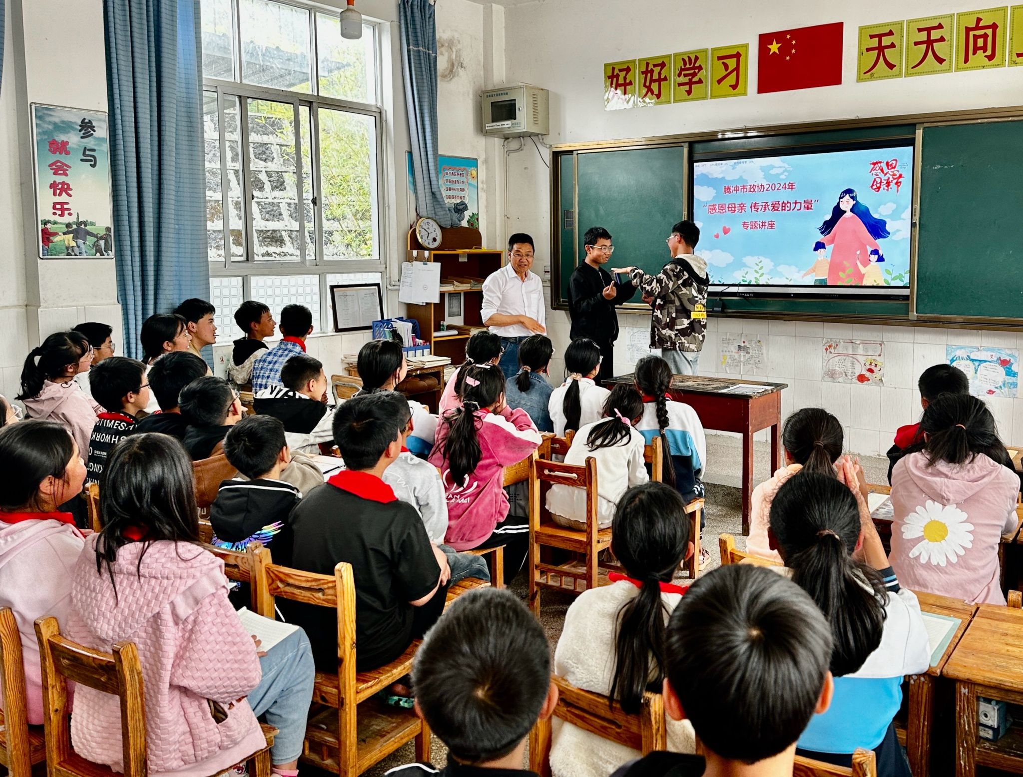 活动以“感恩母亲,传承爱的力量” 为主题,以同听一堂课、同讲一席话、同唱一首歌“三个一”形式开展。在歌曲《妈妈我想你》的歌声中拉开序幕,中国心理学会会员、腾冲市心理协会副会长邓德凡老师作了心理健康暨感恩教育专题讲座。邓老师从什么是校园欺凌,认识校园欺凌的重要性,掌握一些人际交往的方式方法三个方面,并结合如何感恩党、感恩祖国、感恩父母、感恩老师进行了全面讲解。活动期间全程使用普通话,并适时与师生进行互动。活动在合唱歌曲《感恩的心》中结束。