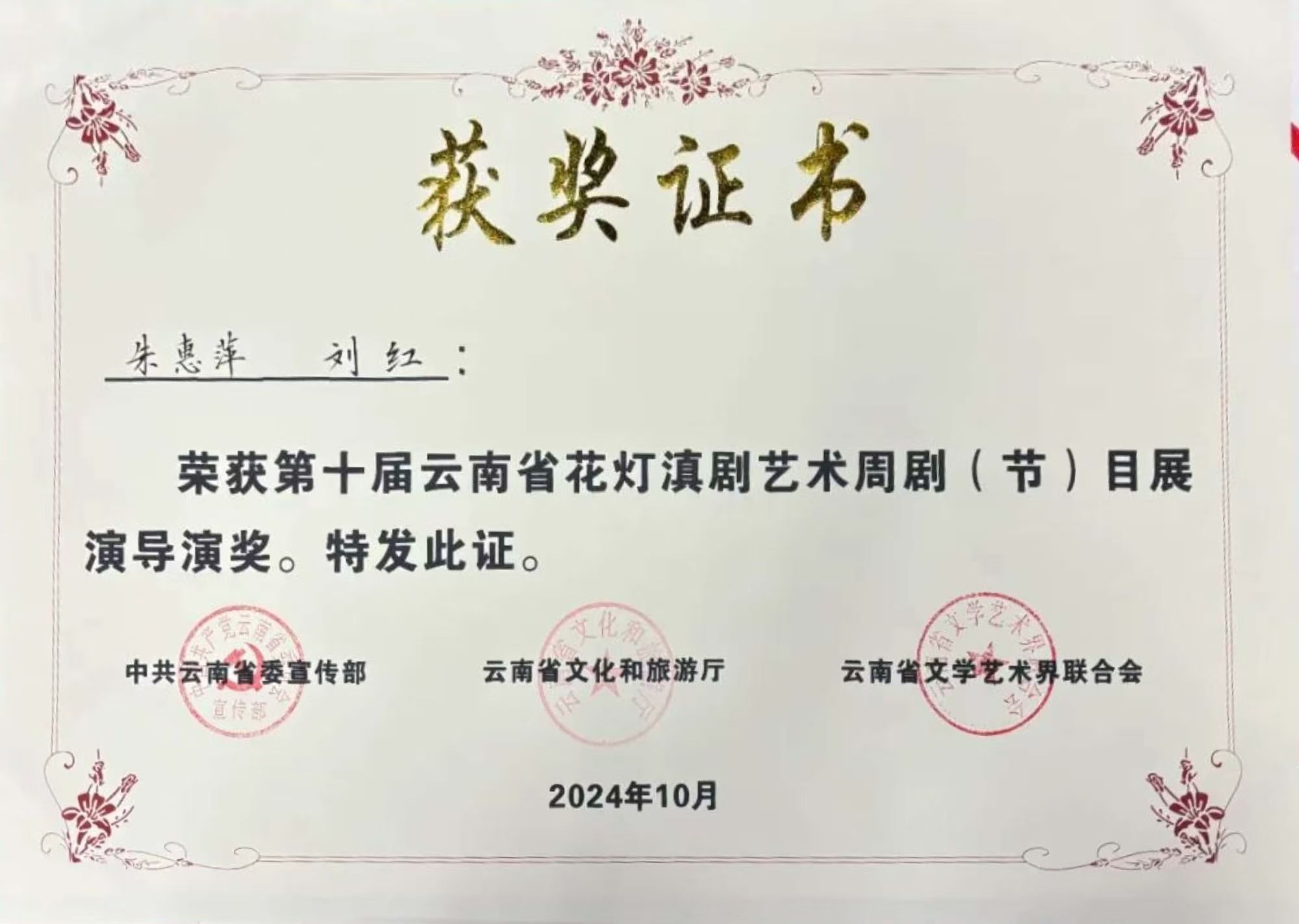 在云南省第十届花灯滇剧艺术周剧(节)目展演中,由隆阳区政协委员工作室委员刘红导演和主演的廉政主题花灯小戏《首付惊梦》获得导演奖。