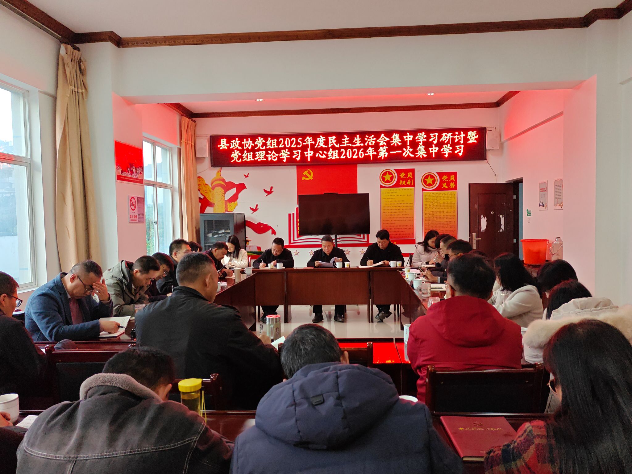 1月26日,龙陵县政协党组举行2025年度民主生活会会前集中学习研讨暨党组理论学习中心组2026年第一次集中学习,深入学习领会习近平总书记关于党的建设的重要思想、关于党的自我革命的重要思想以及关于加强党的纪律建设、作风建设的重要论述,重点学习习近平总书记在中央政治局民主生活会上的重要讲话精神,为开好2025年度民主生活会打牢思想基础。