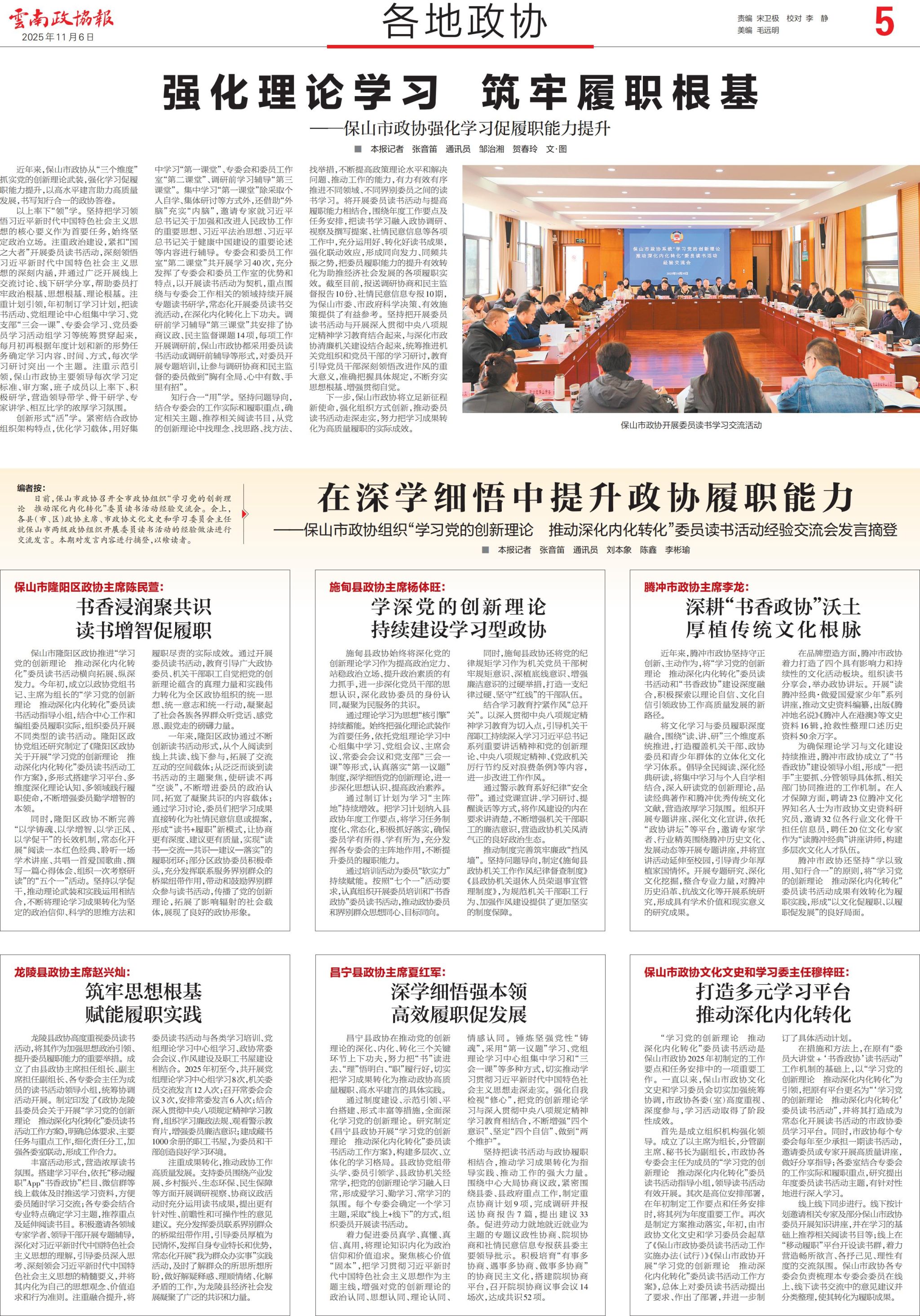 日前,保山市政协召开全市政协组织“学习党的创新理论 推动深化内化转化”委员读书活动经验交流会。会上, 各县(市、区)政协主席、市政协文化文史和学习委员会主任进行交流发言。11月6日《云南政协报》专版刊发会议情况。自即日起,市政协微信公众号陆续对发言内容进行转发。