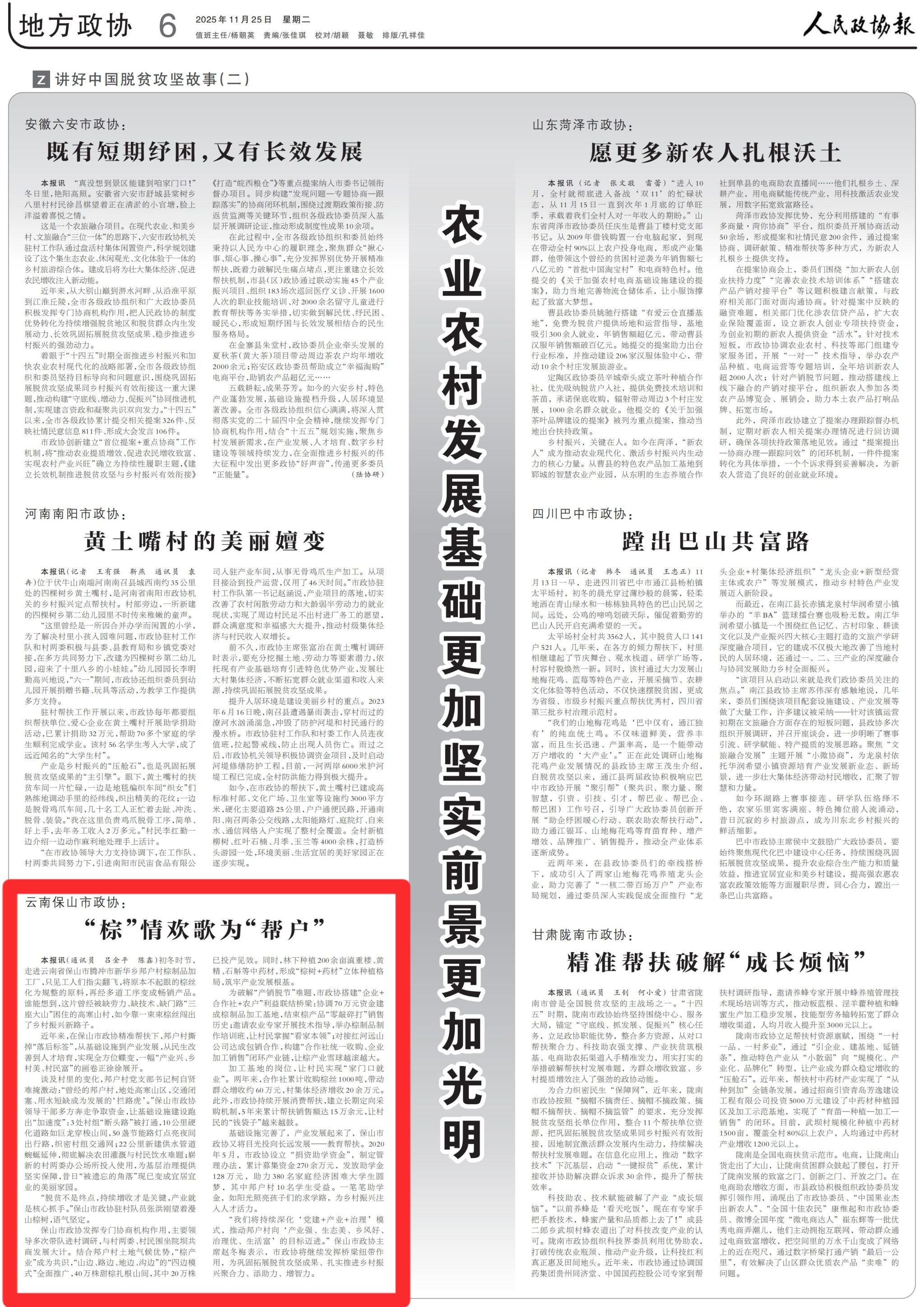 11月24日的《人民政协报》第6版刊发《云南保山市政协:“棕”情欢歌为“帮户”》。全文转载如下: