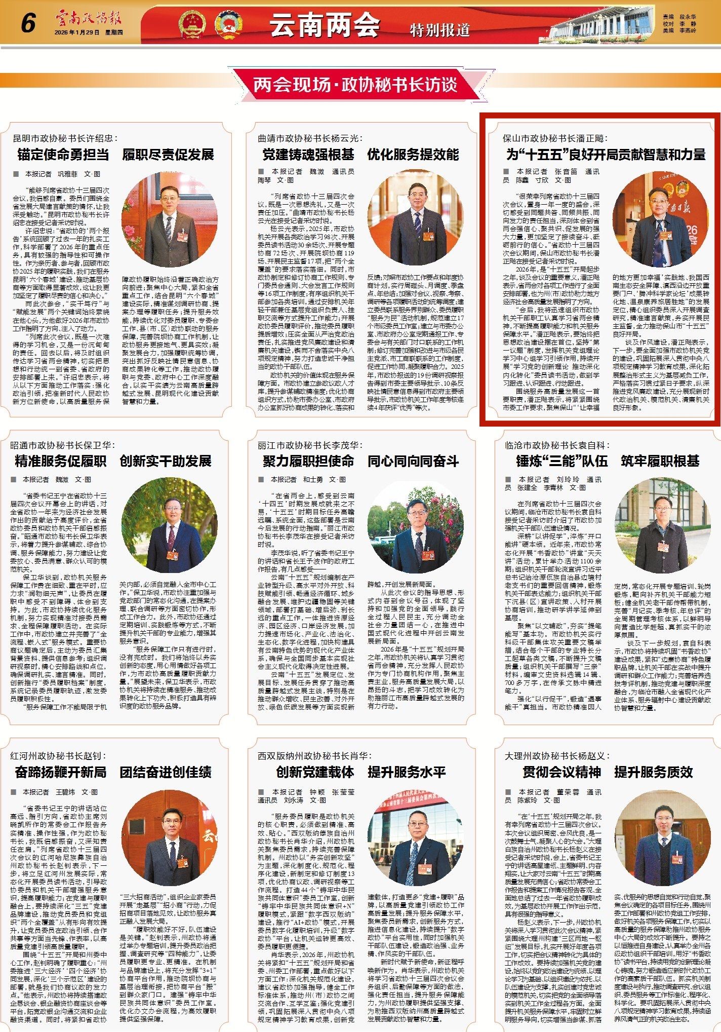 “很荣幸列席省政协十三届四次会议,置身一年一度的盛会,深切感受到同题共答、同频共振、同向发力的责任担当,深刻体会到省两会强信心、聚共识、促发展的强大力量,更加坚定了接续奋斗、砥砺前行的信心。”省政协十三届四次会议期间,保山市政协秘书长潘正飚在接受记者采访时说。