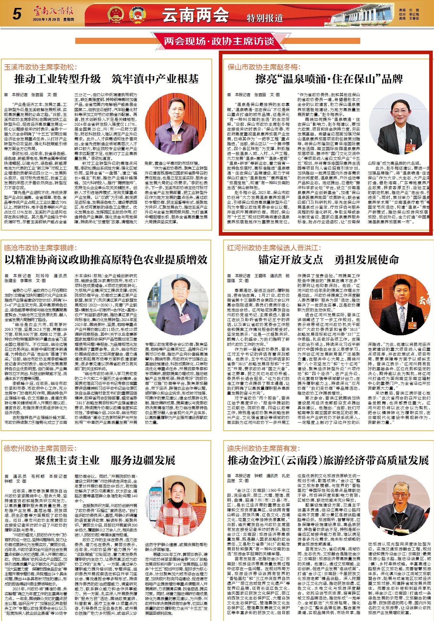 赵冬梅介绍,2025年,保山市政协已将“大力发展温泉康养旅居产业,引领保山旅游高质量转型升级”列为专题议政性常委会会议议题,并组织开展调研协商。同时,保山市“十五五”规划已明确将建设温泉康养旅居胜地作为重要发展定位。“作为省政协委员,我和其他住保山的省政协委员一道,希望借助本次全会的议政建言,助力保山温泉康养旅居胜地建设,为地方高质量发展贡献力量。”赵冬梅表示。