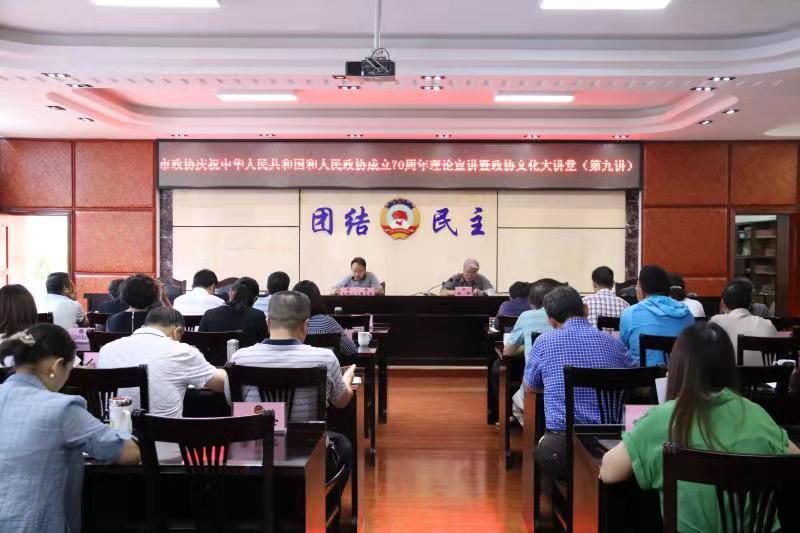 7月1日,为庆祝中华人民共和国和人民政协成立70周年,市政协举行政协文化大讲堂第九讲,邀请省社科院研究员、哲学所与马列所原所长向翔以“艾思奇与其哲学贡献”为题作专题讲座。市政协秘书长潘正飚主持会议,机关全体干部职工,市级各民主党派和工商联、驻市政协机关纪检组部分干部参加学习。