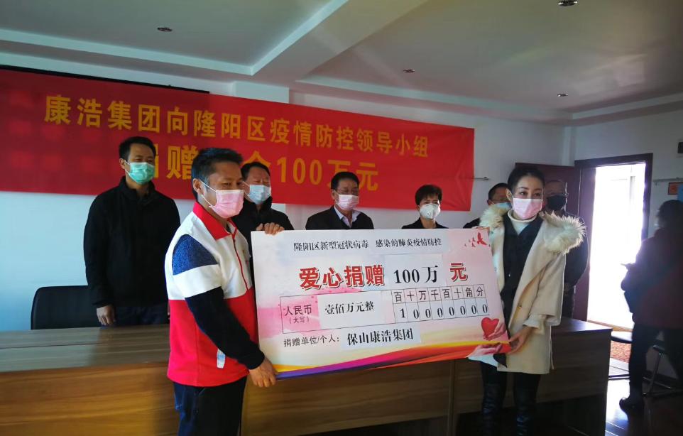 2月4日下午,在保山市政协副主席、市工商联主席温仕红牵线搭桥下,保山市政协委员、康浩集团总经理杨越代表云南保山康浩集团公司向隆阳区红十字会捐资100万元爱心款,用于抗疫防控工作。在抗击新型肺炎疫情的关键时刻,市政协委员积极捐赠,为疫情抗战一线提供了物质保障和精神动力。