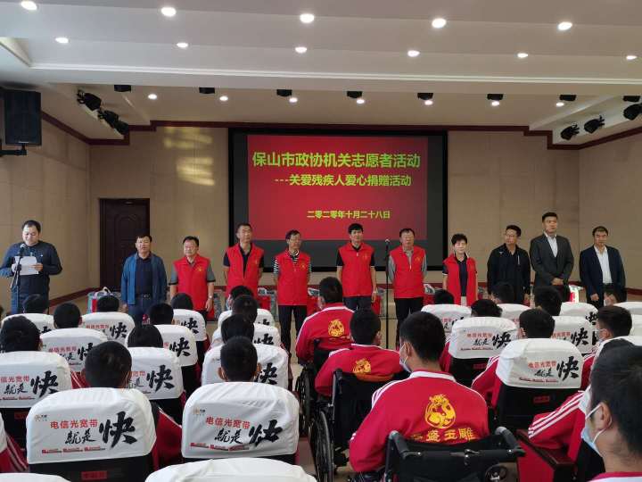 10月28日上午,保山市政协领导带领机关志愿者一行赴龙陵县职业技术学校开展志愿者爱心捐赠活动,给该校残疾学子送去了行李、服装等爱心物品。
