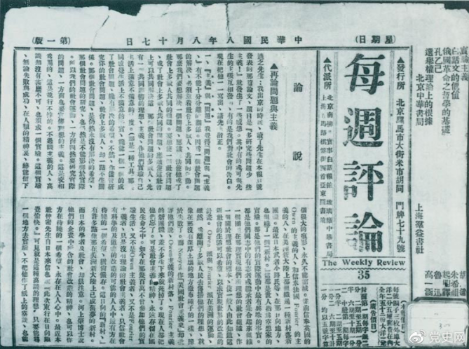 1919年8月17日,李大钊在《每周评论》第35期发表《再论问题与主义》一文,对胡适的观点作了严正的批驳。