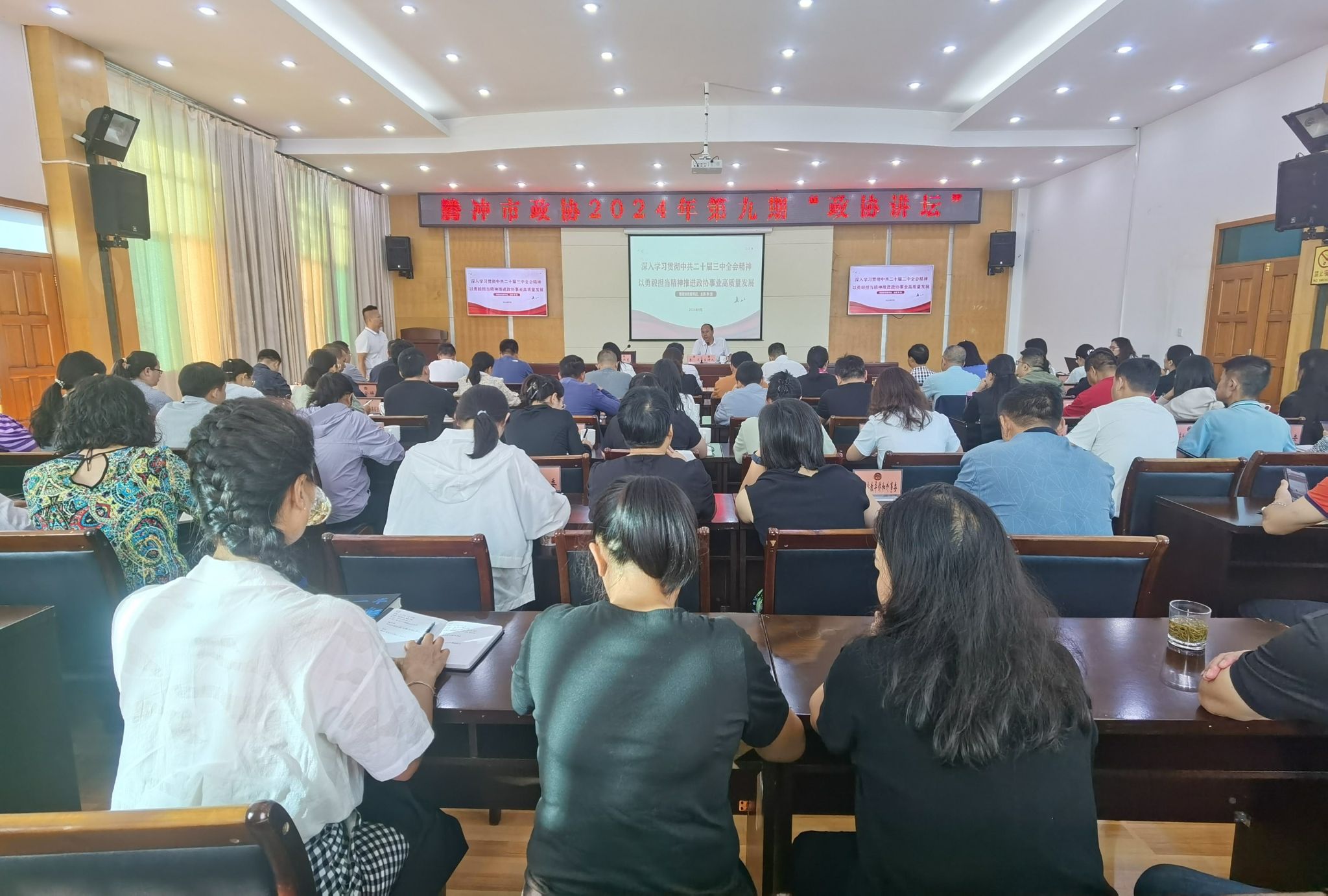 9月20日,腾冲市政协举行2024年第九期“政协讲坛”暨学习贯彻中共二十届三中全会精神专题宣讲会。市政协主要负责同志以《深入学习贯彻中共二十届三中全会精神 以勇毅担当精神推进政协事业高质量发展》为主题,从深情回顾人民政协75周年发展历程、深入学习领会习近平总书记重要讲话精神、全力以赴抓好全会精神贯彻落实等三个方面进行了宣讲。
